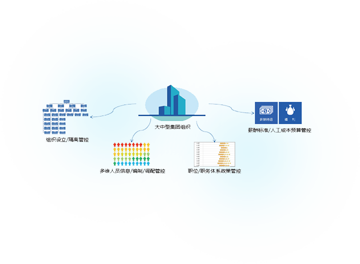 在组织规模大型化、业态多元化、多地域分布、管理水平参差不齐环境下,满足集团总部对下属企业进行人力资源差异化管控而提出各类管理需求,增强组织协作