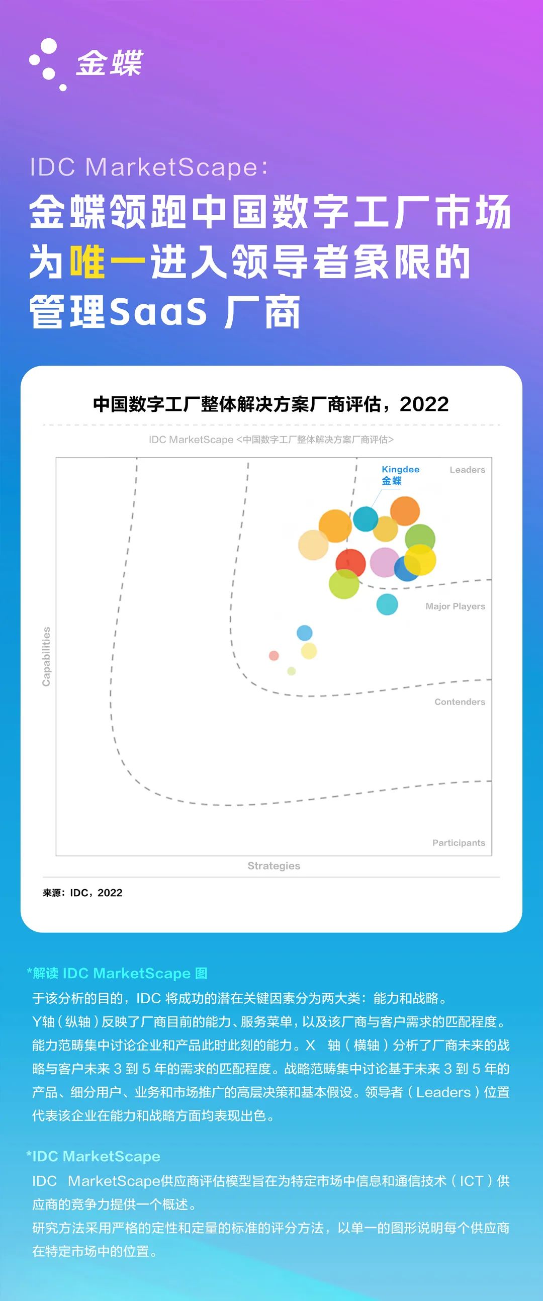 近日,全球知名信息技术咨询公司IDC发布最新《IDC MarketScape: 中国数字工厂整体解决方案 2022 年厂商评估》。金蝶凭借其出色的产品和行业解决方案、百万制造企业最佳实践以及完备的实施方法论,位居中国数字工厂解决方案市场的领导者位置,同时也是唯一进入领导者象限的SaaS 管理云厂商!