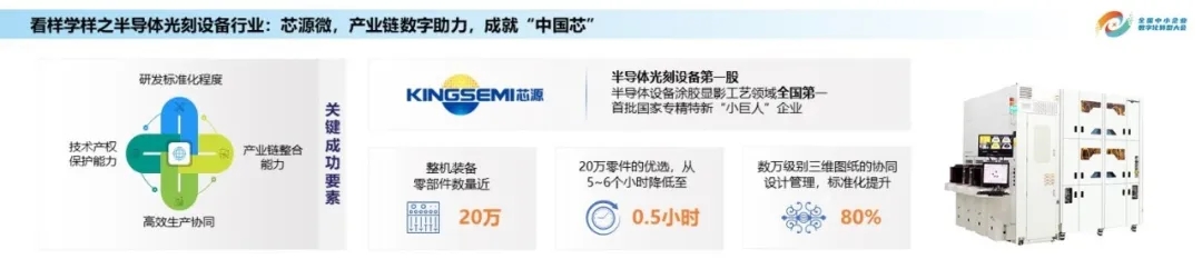 在这个过程中,我们和芯源微一起从产品设计开始,一直到生产端包括销售端,端到端地解决这些订单处理问题和产品设计工艺改造的问题。我们帮助他们实现了这20万个零件的优选,从过去的5-6个小时降低到了30分钟;把数万级别的三维图纸的协同设计管理的标准化提升了80%,支持他们在沈阳、大连、上海等多地的研发工程。所以今天,芯源微已经通过数字化高效地支撑企业的生产技能